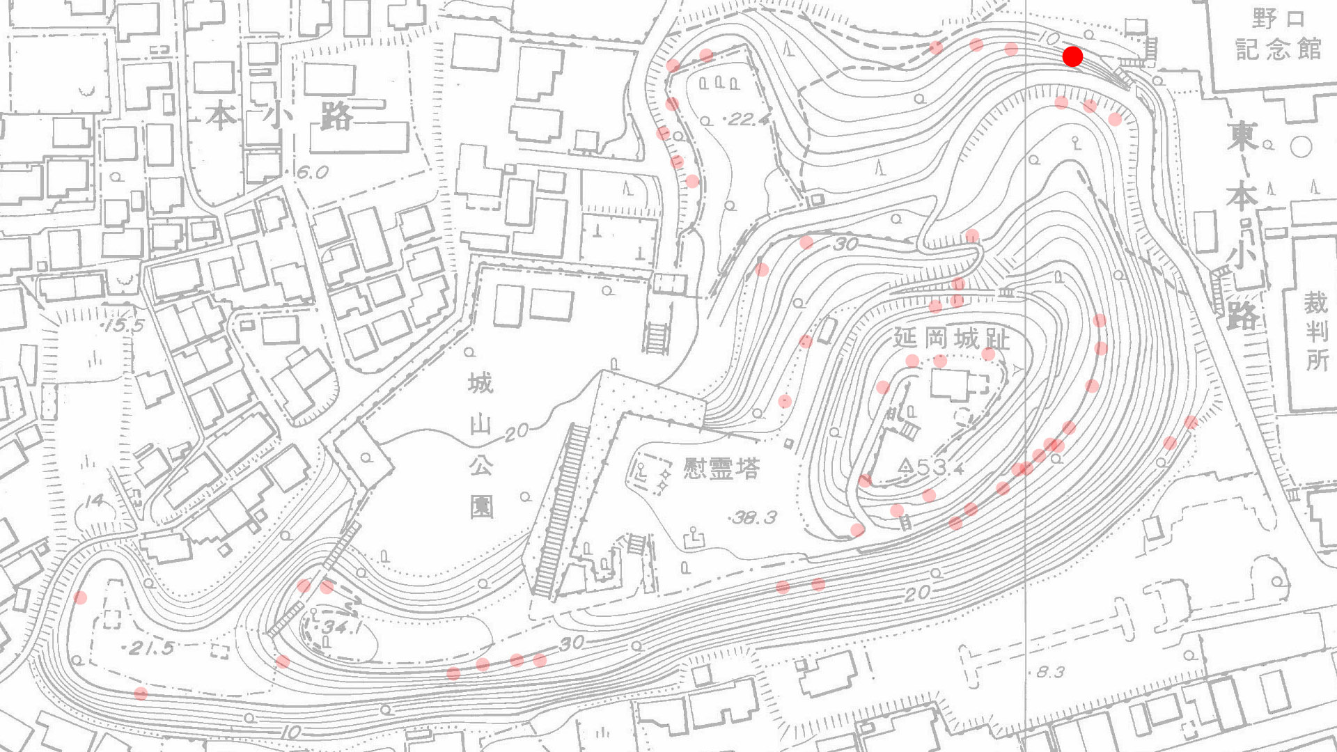 1-03 花弁は白色の6弁で、ラッパ咲きの極小輪。 花糸は淡黄色で、数は中程度の筒しべ。 城山の白色の中では最大のヤブツバキである。(幹周り約70cm) 場所 城山南駐車場から三の丸跡への坂道途中の曲がり角。 1-02 1-04
