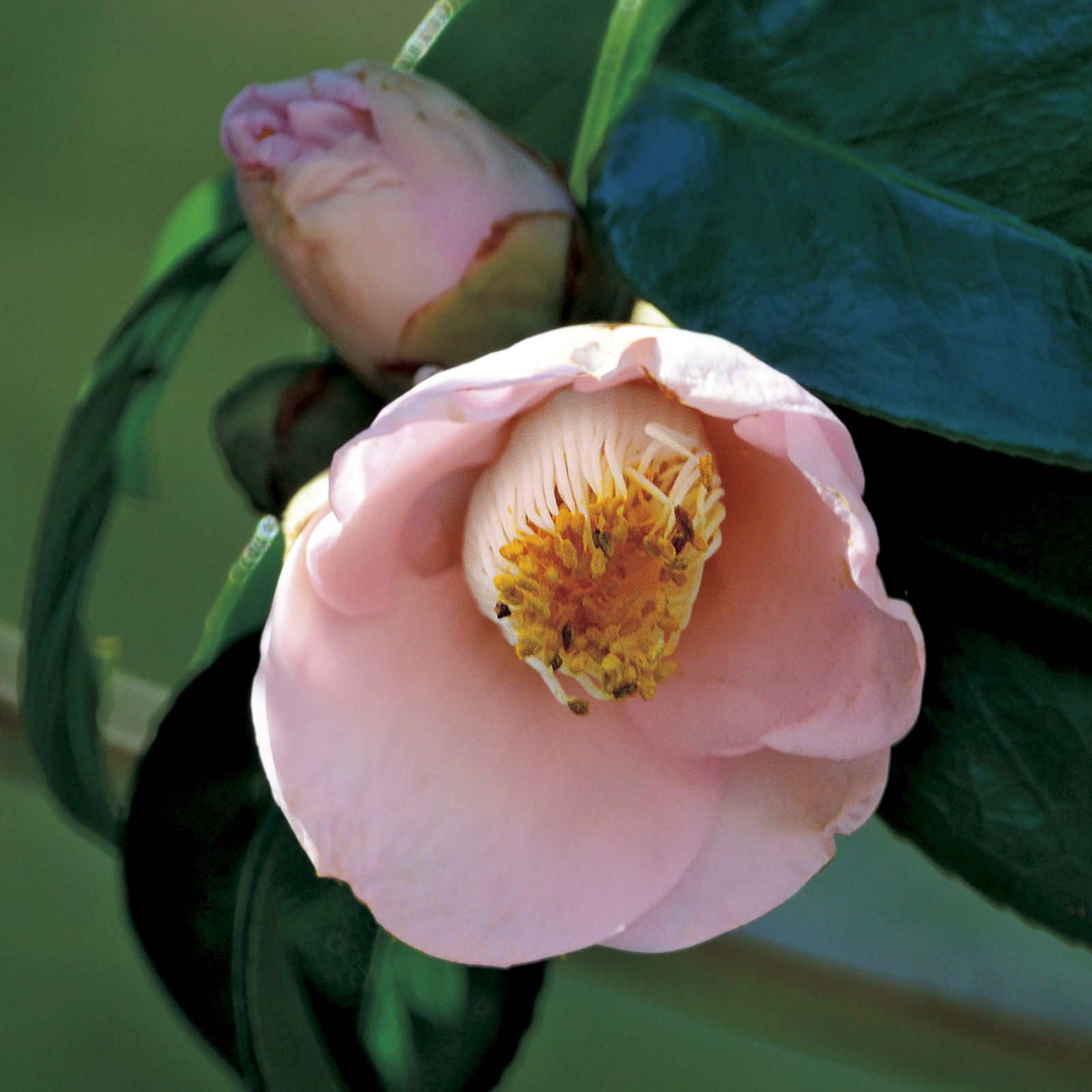 5-23 花弁は淡い桃色の5〜6弁で、ラッパ咲きの極小輪。 花糸は白色で、数は中程度の筒しべから閉じしべ。延岡城山ヤブツバキを楽しむ会が「城山」と命名。 場所 鐘撞堂管理棟の裏(西北角) 5-22 5-24