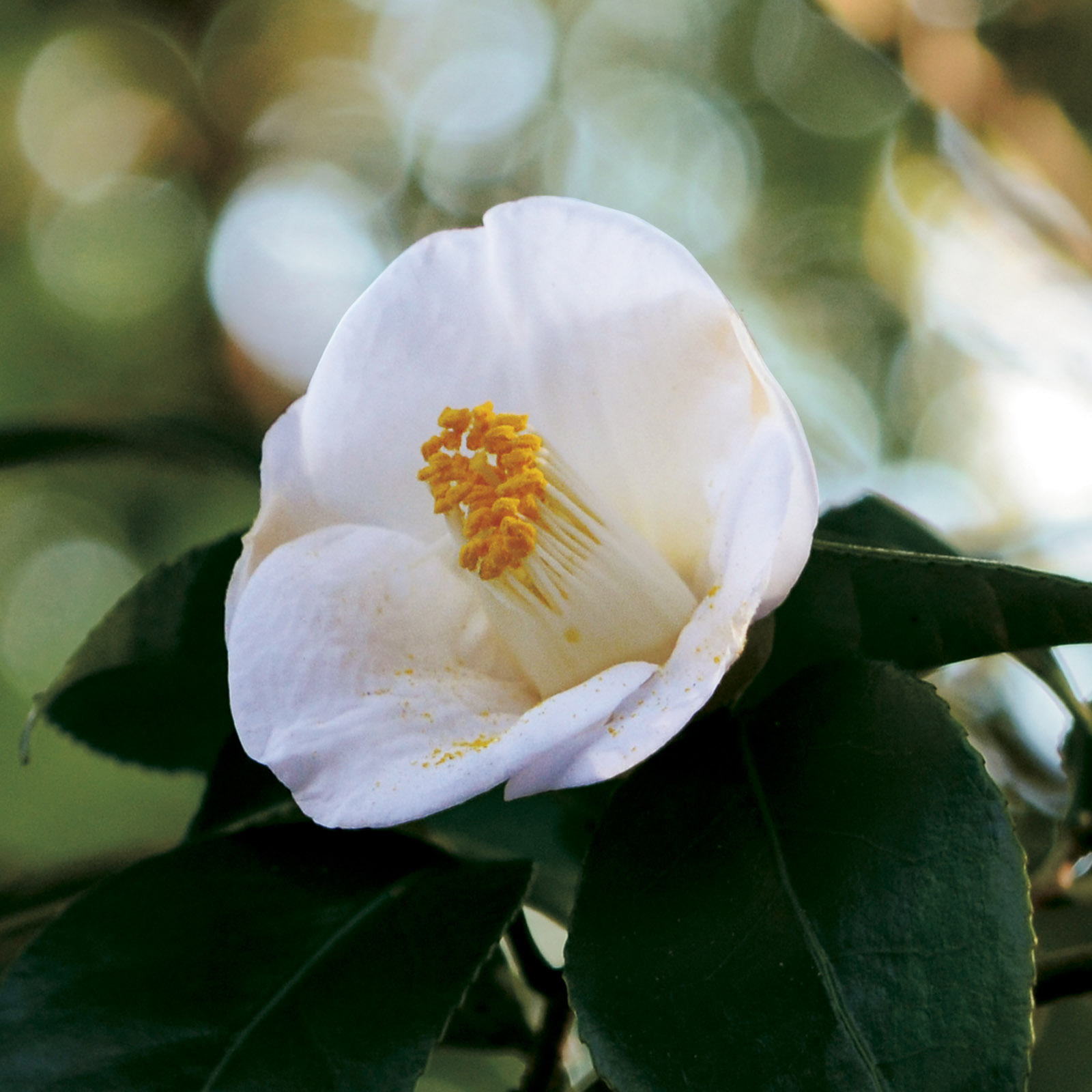 1-03 花弁は白色の6弁で、ラッパ咲きの極小輪。 花糸は淡黄色で、数は中程度の筒しべ。 城山の白色の中では最大のヤブツバキである。(幹周り約70cm) 場所 城山南駐車場から三の丸跡への坂道途中の曲がり角。 1-02 1-04