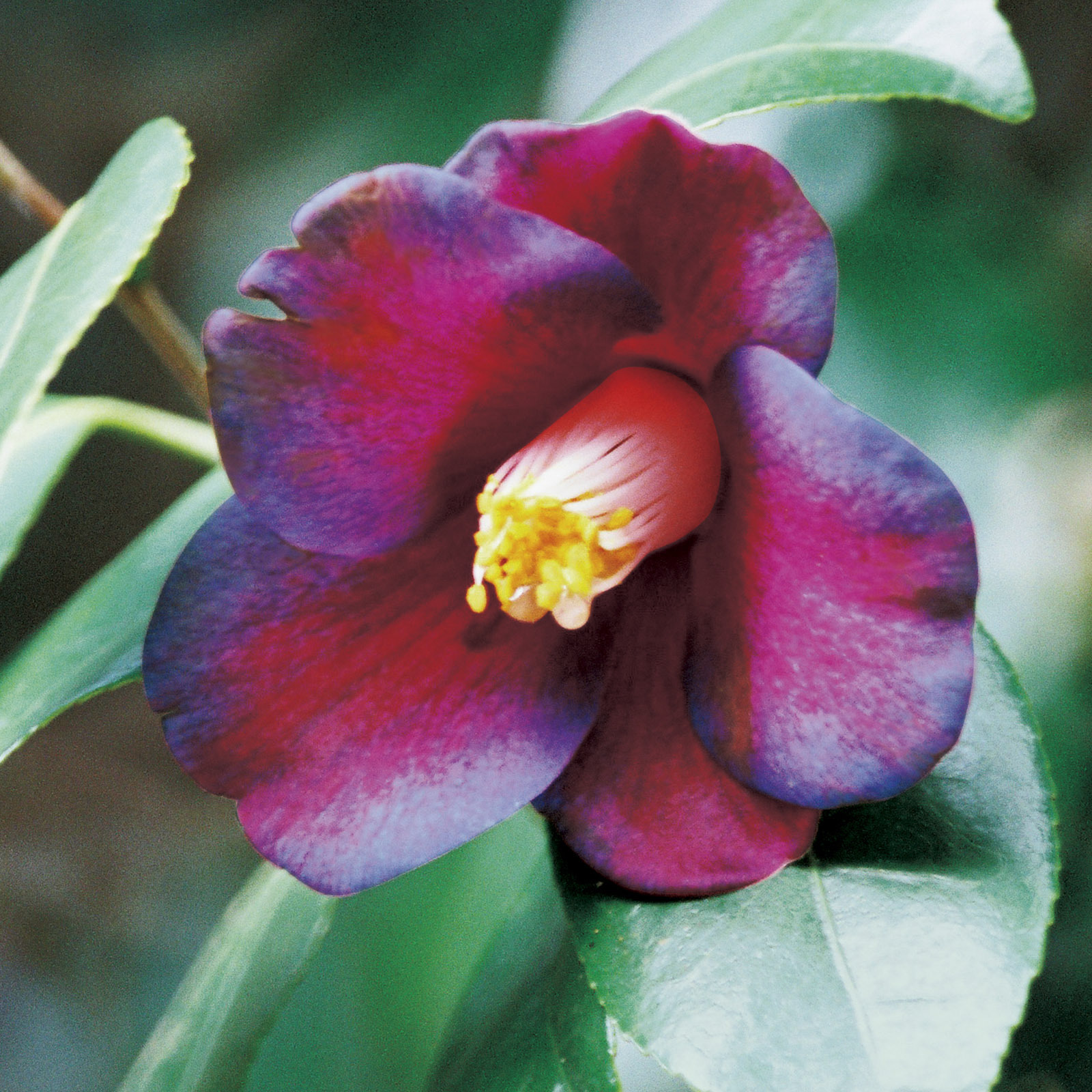 2-08 花弁は濃紅地に紫覆輪の5弁で、ラッパ咲きの極小輪。弁脈も見られる。 花糸は白色で、数は中程度の筒しべ。城山ヤブツバキ群の中でも紫覆輪は珍しい。離れてみると黒っぽく見える。 場所 北大手門に向かう道の左手斜面。 2-07 3-01