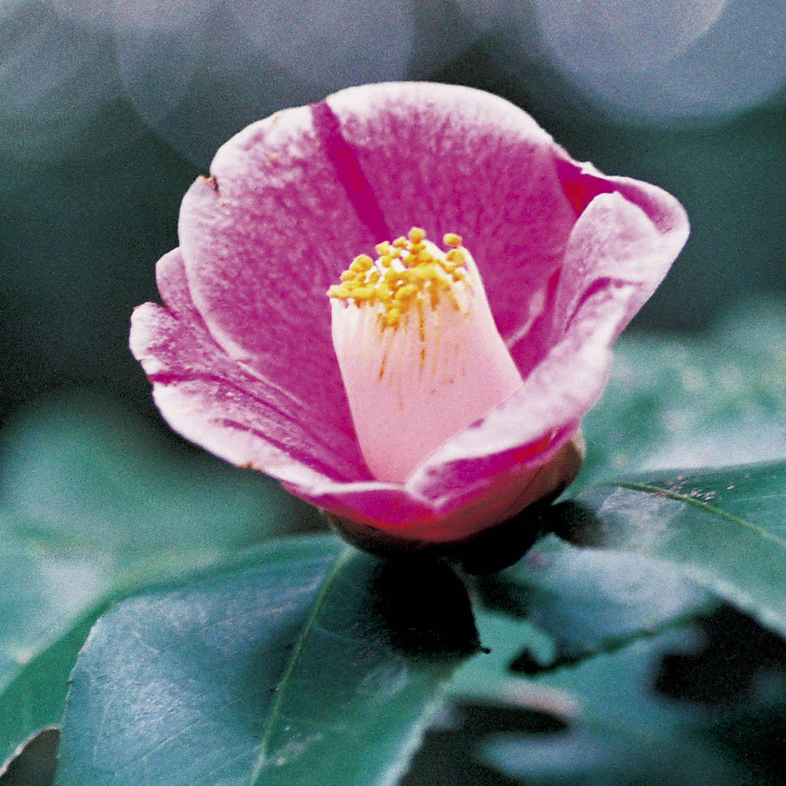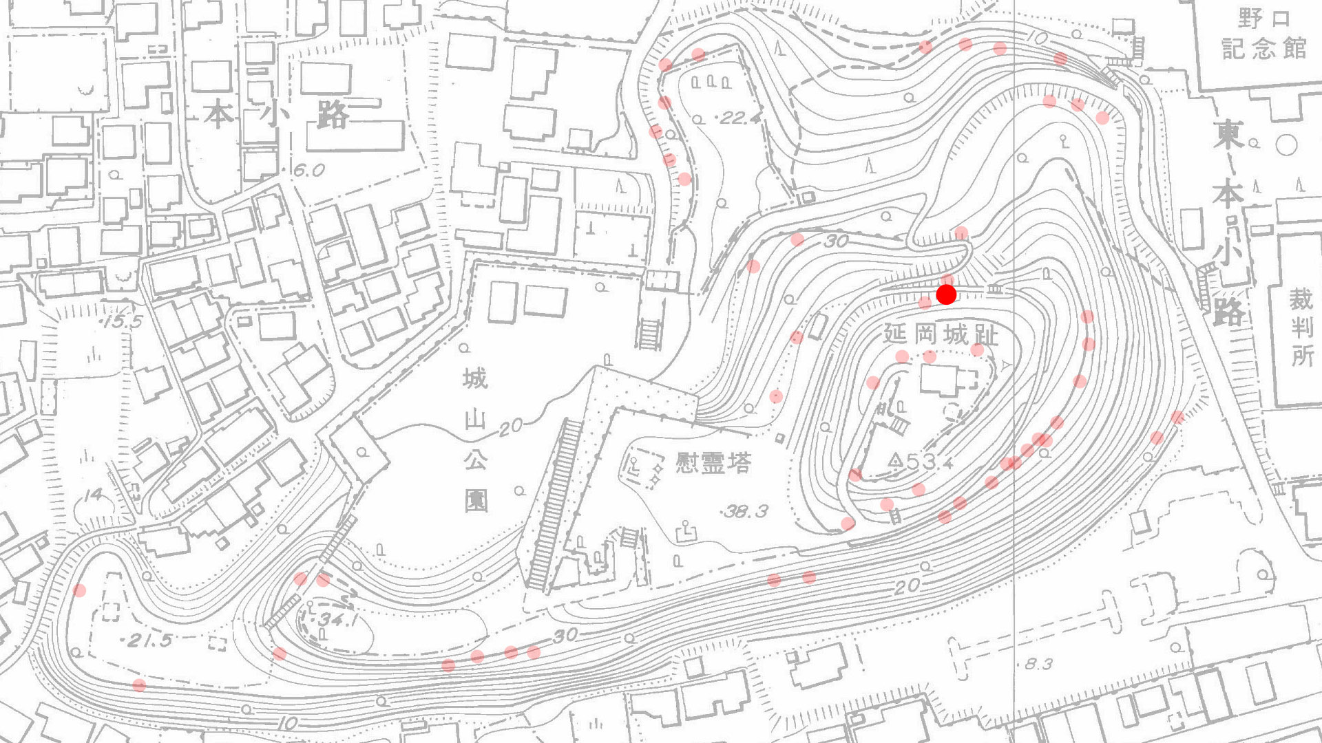 5-04 花弁は桃色地に紅色の縦絞りと白覆輪がある5〜6弁で、ラッパ咲きの小輪。弁脈も全体に出ている。 花糸は白色で、数は中程度の筒しべ。 場所 本丸跡から後藤勇吉碑へ向かう遊歩道沿いの斜面。 5-03 5-05