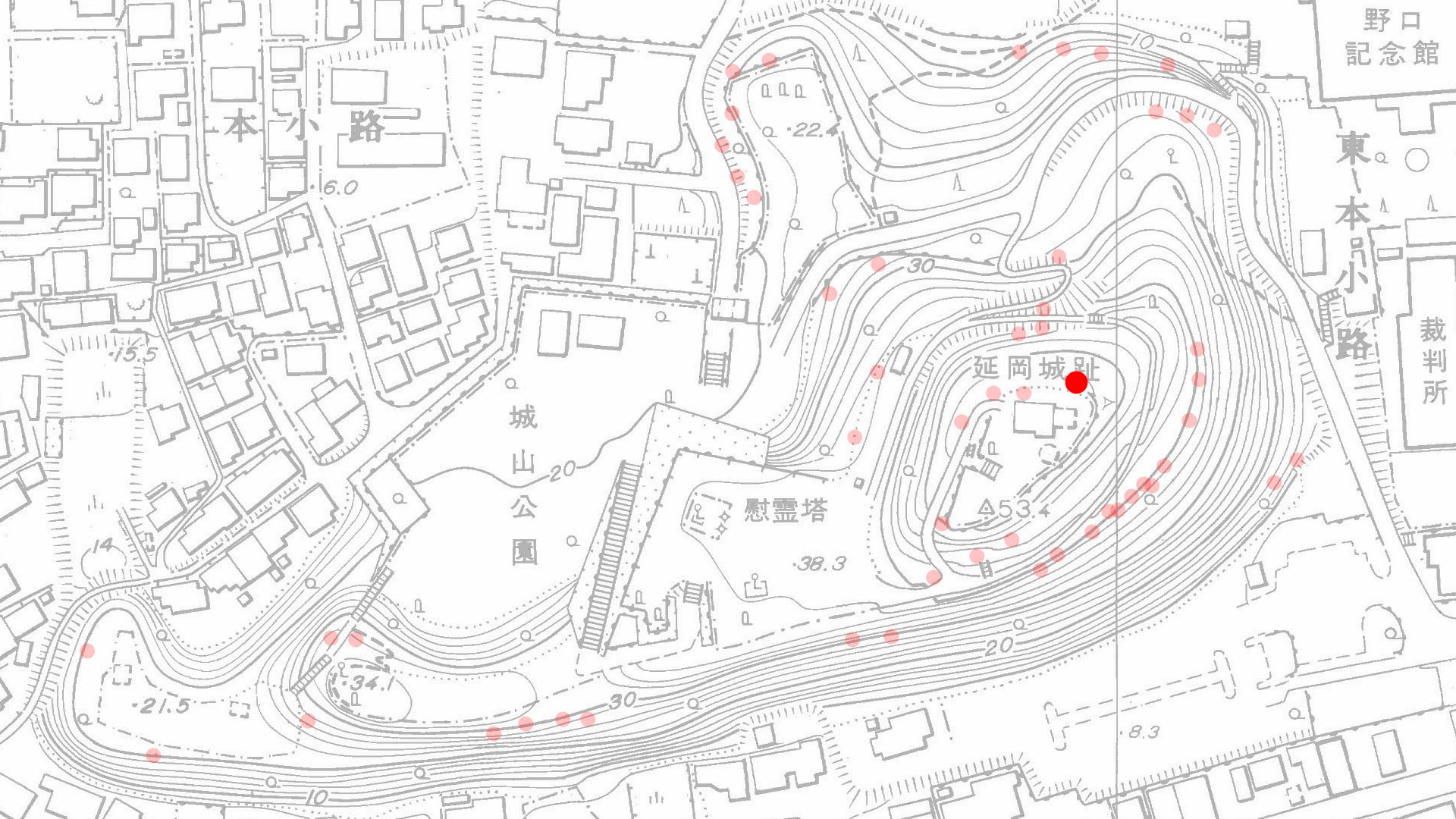 5-24 花弁は6弁で、白地に桃色の筋入り(時に筋の幅が花弁の半ばに至る)。筒咲きの小輪。 花糸は白色で、数は中程度の筒しべ。紅桃花と咲き分ける。 場所 鐘撞堂管理棟のすぐ裏(北側) 5-23 亀井神社エリア
